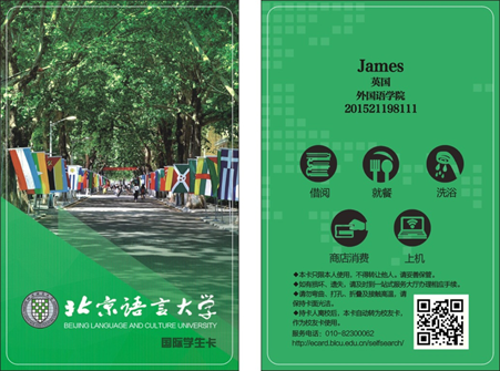 北京语言大学校园卡是学校师生在校的通用身份识别卡和消费卡,主要用于食堂就餐、超市消费、图书借阅、网费充值、开学报到、成绩单打印、包裹领取等,可谓“一卡在手,走遍校园”。每年新入学的国际学生来校后即可领取校园卡,有关校园卡卡号、密码、充值、挂失、补卡、查询消费明细的详细内容请关注:“北语信息化”微信公众号。