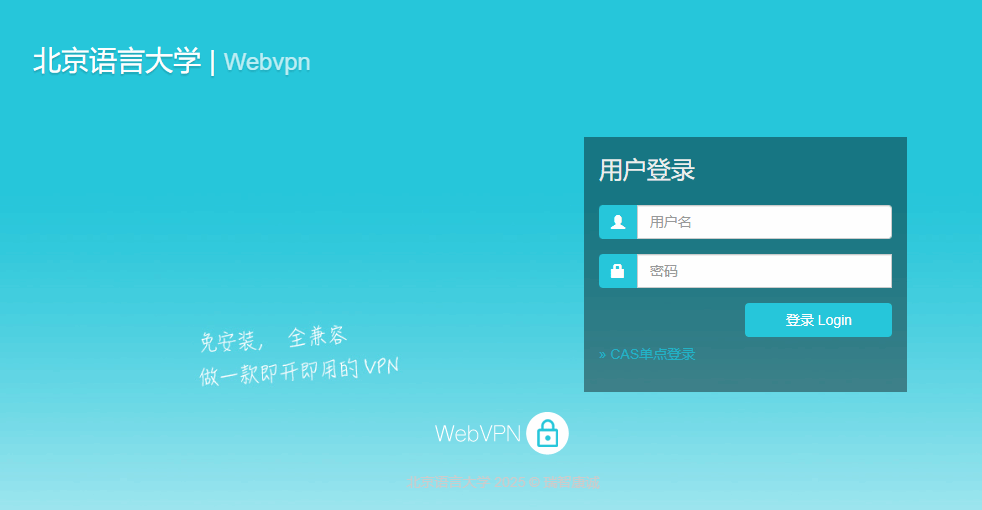 Webvpn | 您可输入http://webvpn.blcu.edu.cn或者点击北语官网下方的“北语vpn”链接进入登录页面。账号密码同统一身份认证 。 | |
