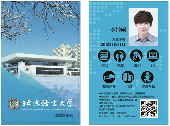 北京语言大学校园卡是学校师生在校的通用身份识别卡和消费卡,主要用于食堂就餐、超市消费、图书借阅、网费充值、开学报到、成绩单打印、包裹领取等,可谓“一卡在手,走遍校园”。每年新入学的中国籍学生来校后即可领取到校园卡,关于校园卡卡号、密码、充值、挂失、补卡、查询消费明细等详细内容请关注:“北语信息化”微信公众号。