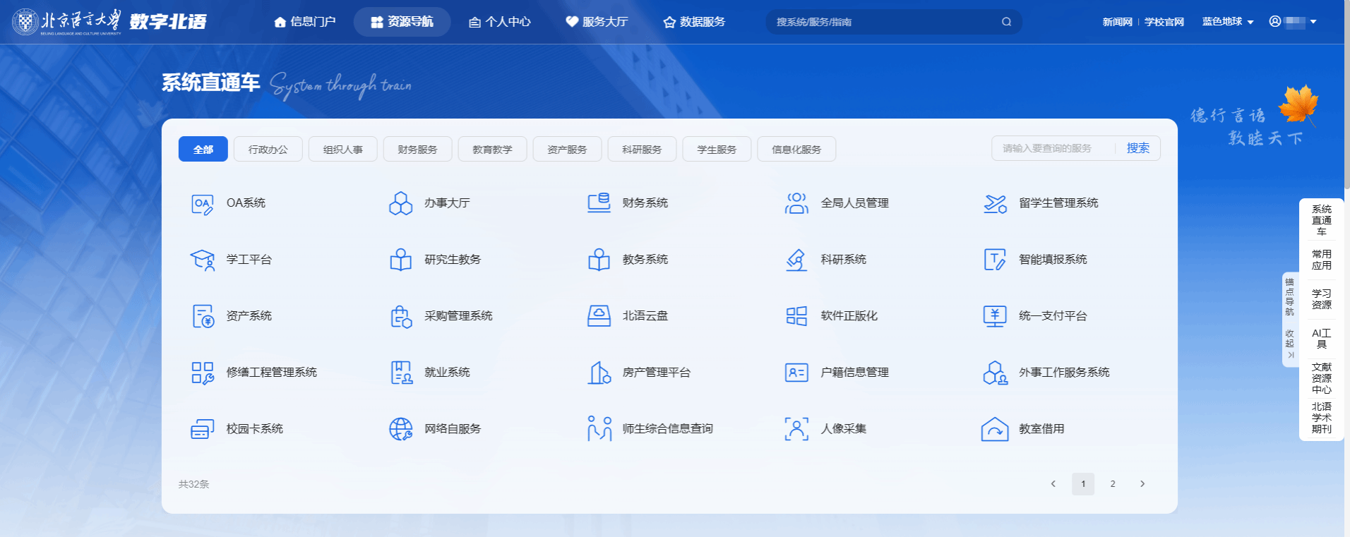 数字北语是北语人的一站式综合服务管理平台,它全面强大便捷的使用功能,使它成为师生们不可获缺的好帮手。教职工可通过数字北语收发邮件、查询工资、课表、校历、通知等,还可直接访问本科生教务系统、研究生系统、留学生系统、北语慕课、图书馆系统、网络自服务系统、校园一卡通系统等等,无需再次认证。