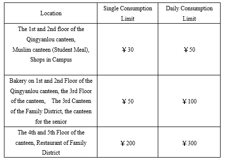 Single consumption limit and daily consumption limit are set to avoid the great loss after losing the campus card. The specific standards are as follows: