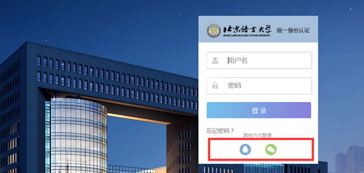 绑定方法:点击数字北语右上角“个人头像”—“个人中心”,单击“账号绑定”,选择“腾讯QQ”或“微信”,并按提示进行个人QQ及微信的绑定。之后便可以在登录界面点击微信或QQ图标进行登录,如下图。