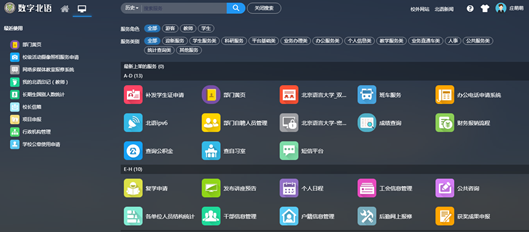 3)顶部搜索中心包含我校全部应用,可根据师生不同服务角色和服务类别进行筛选,并可通过历史检索数据或关键词检索,快速查找相关应用;
